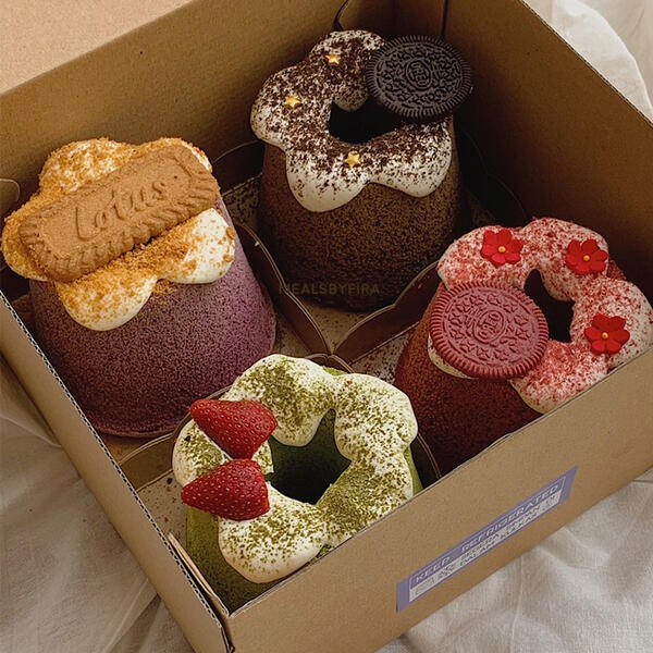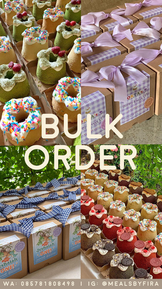 Choose 4 flavor in a box: vanilla confetti, oreo gold, matcha strawberry red velvet, ube lotus, double choco.Get free greeting card, hang tag, ribbon, stickers and 2 blow candle. box 22 x 22 cm